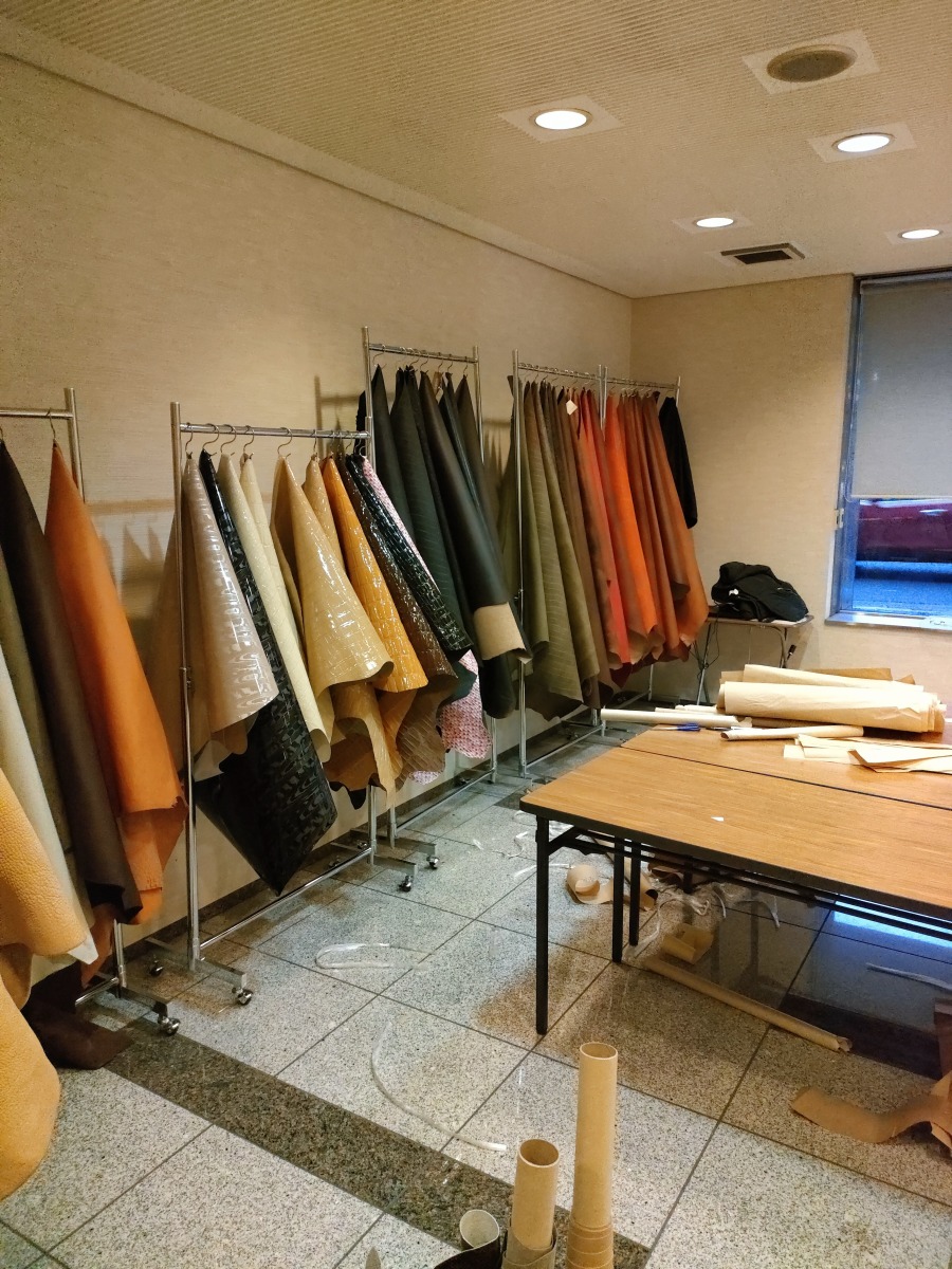 定番のタンニン鞣しの革と新商品の脱クロムコンビニ鞣しの革であるNベリンダ、アルモシュリンクの展示販売